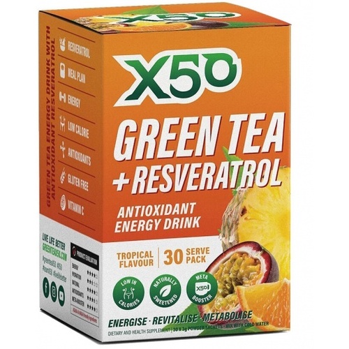 X50’s original formulation blends the benefits of green tea and resveratrol into a refreshing tropical-flavoured cold beverage sweetened with plant-based, low-calorie xylitol. It supplies clean, natural energy as well as EGCG and other catechins, polyphenols, and a number of antioxidants – including extra vitamin C and resveratrol itself, which has such potent antioxidant activity that it has significant anti-ageing effects. The concentrated green tea extract may also encourage thermogenesis to boost the metabolism and burn more calories and fat, making it easier to meet your weight control goals – and every pack includes free access to X50’s Accelerated Weight Loss Program with targeted advice on healthy lifestyle and diet.