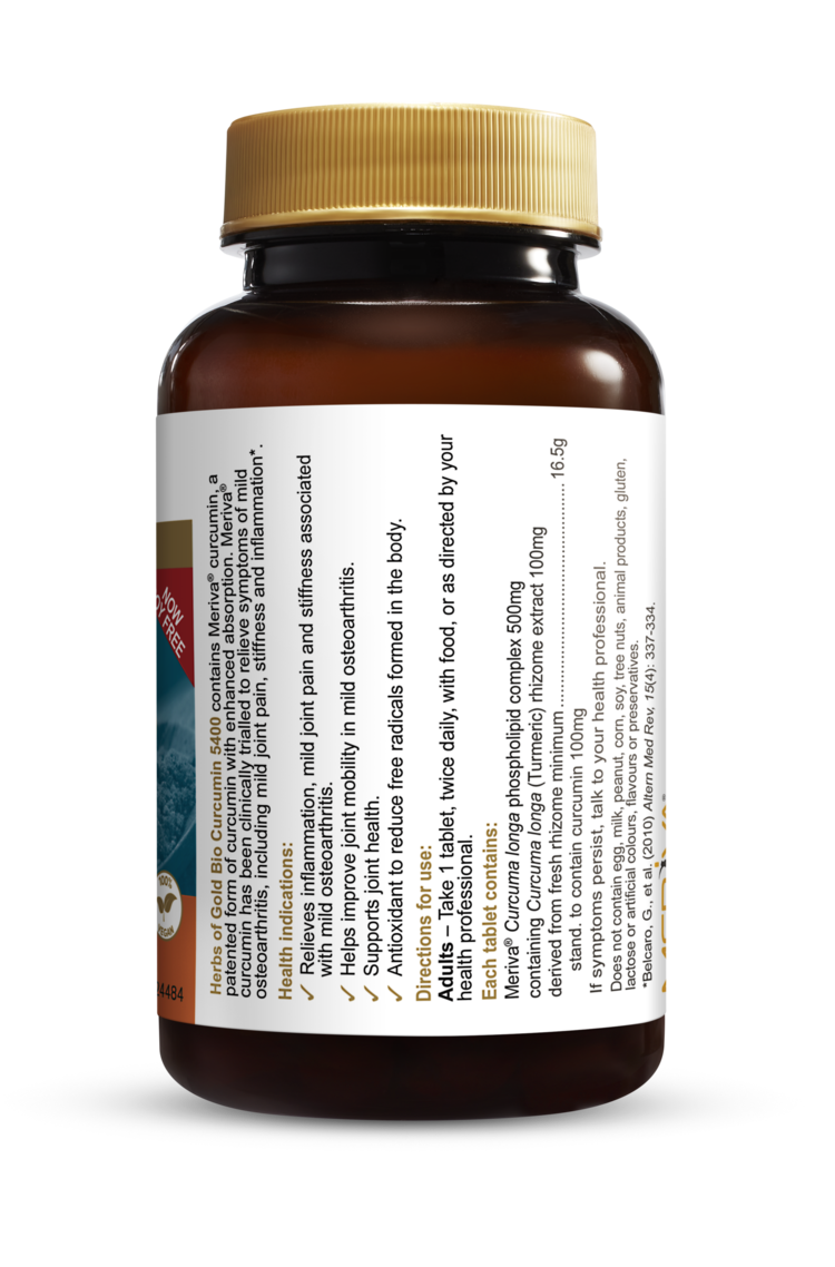 Herbs of Gold Bio Curcumin 5400 contains Meriva®, a clinically trialled* form of curcumin that relieves inflammation.