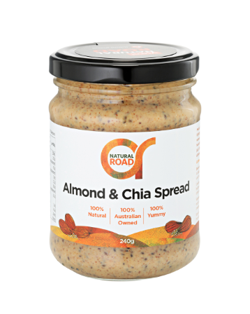 Natural Road Almond & Chia Spread is made from pure and natural, lightly roasted almonds with whole chia seeds added.